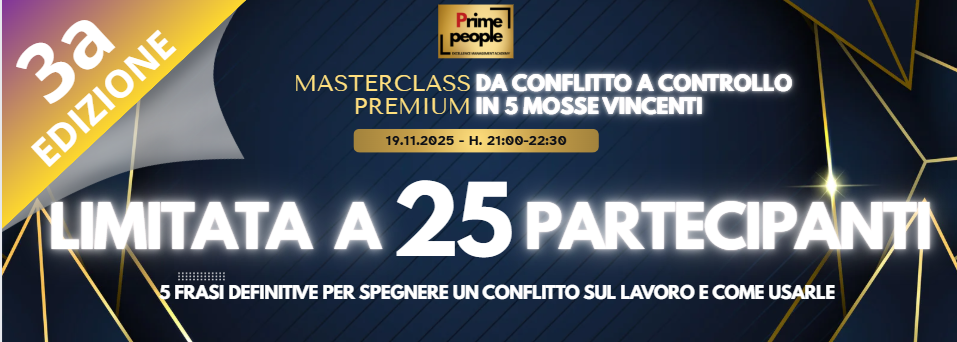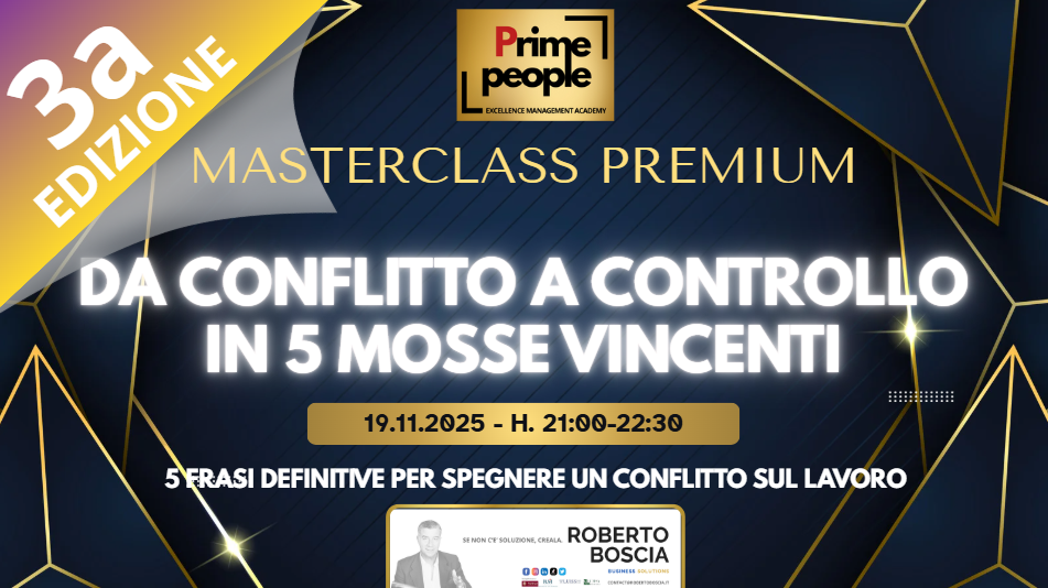 TERZA EDIZIONE MASTERCLASS PREMIUM "Da Conflitto a Controllo in 5 mosse vincenti". 19 Novembre 2025 dalle 21 alle 22:30