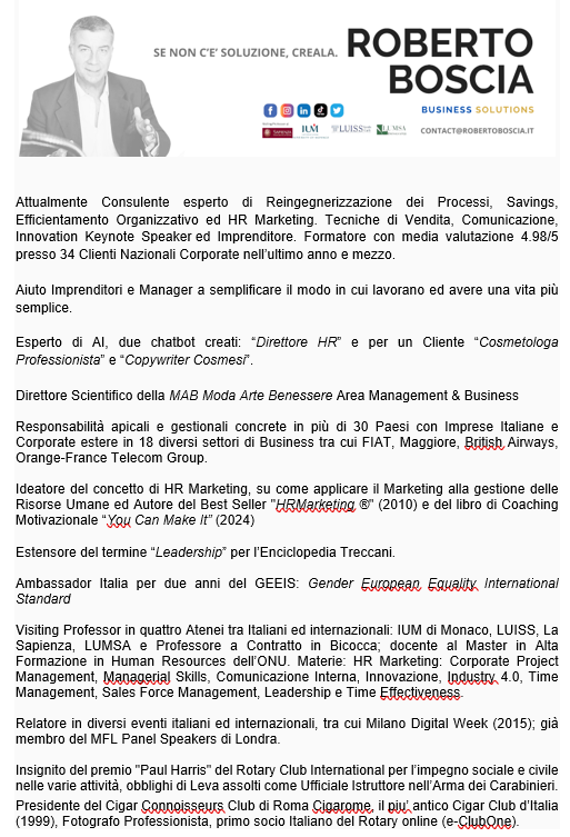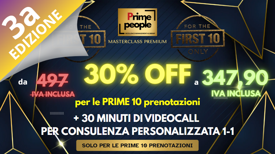 Prenoto il mio postoEARLY BIRD: Inserendo il codice sconto: "Masterclass5-C2", se sarai tra i primi 10 a prenotare godrai anche di una attenzione pari al 30% dell'importo, E in aggiunta 30' DI CONSULENZA IN Video Call PERSONALIZZATA SULLE TUE ESIGENZE.